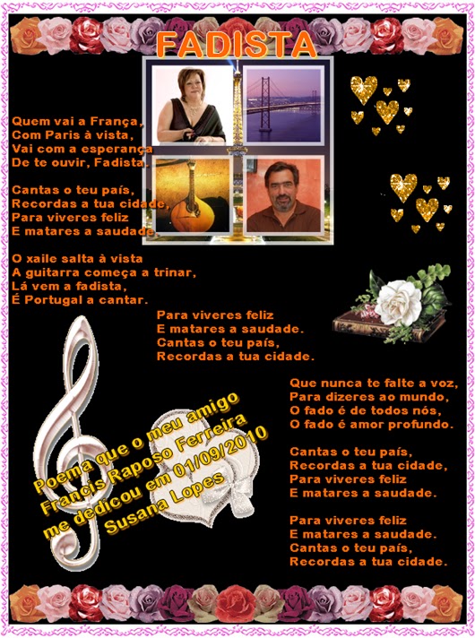 - Sou português, filho de pais incógnitos. Nasci em Lisboa, percorri Portugal e pela mão de Amália Rodrigues, corri mundo. Estou em toda a parte em que haja um português. Sou um capítulo de cultura portuguesa e a expressão máxima de Portugal. O Menor foi meu pai e minha mãe, o Mouraria é meu amante e casei-me com o Corrido. Tenho muitas namoradas, as Meninas Músicas filhas de distintos pais, os Meninos Poemas também namoram com elas, amo os Poetas ♥ ! Para fazer pirraça sou dedilhado numa guitarra, por vezes choro outras rio ... A D. Viola dá-me a marcação. Muito se diz sobre mim e eu continuo a ser mistério, sou amante, namorado, sou casado e sou galdério, sou leviano, atordoado mas também sei ser sério. Gosto da luz da candeia e do cintilar das velas, mas também gosto dos holofotes e do palco, sou vaidoso, sou boémio, sou artista, sou sofredor, sou alegre, sou verdade, sou português e por isso sou fadista! Gosto que me cantem bem, que me digam bem e que não me troquem as palavras... Posto isto, sou a canção mais bela do mundo ♥ !